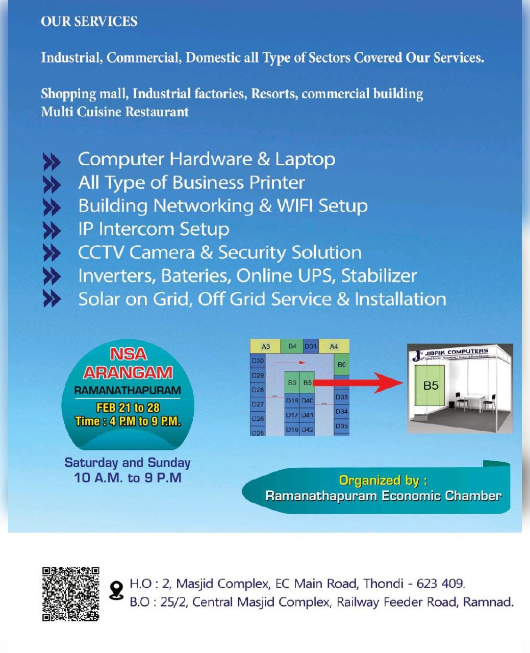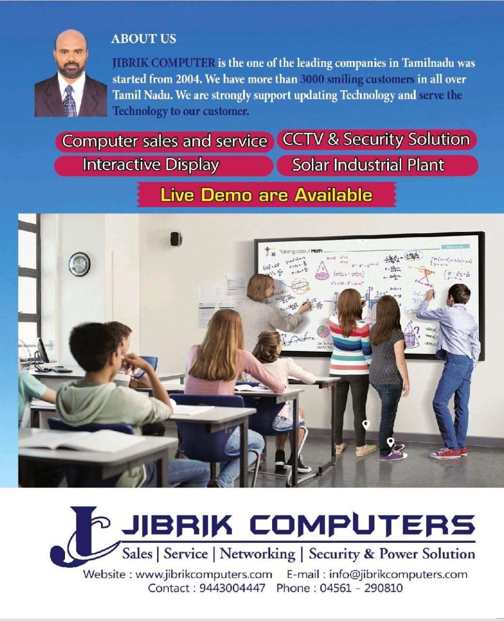 Jibrik computer is the one of the leading companies in Tamilnadu was started from 2006 we have more than 3500 smiling customers in in all over Tamil Nadu we are strongly support updating Technology and serve the Technology to our customer we are doing business with "Computer Sales and Service" "POS billing machines" "CCTV" "Interactive Panel Signage Display" "Business TV" "Solar industrial plant on grid off grid solar projects" "UPS inverter online UPS Servo stabilizes"